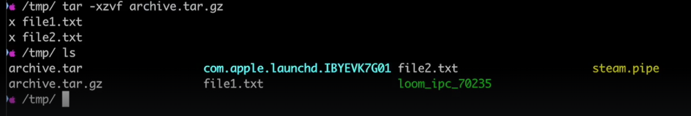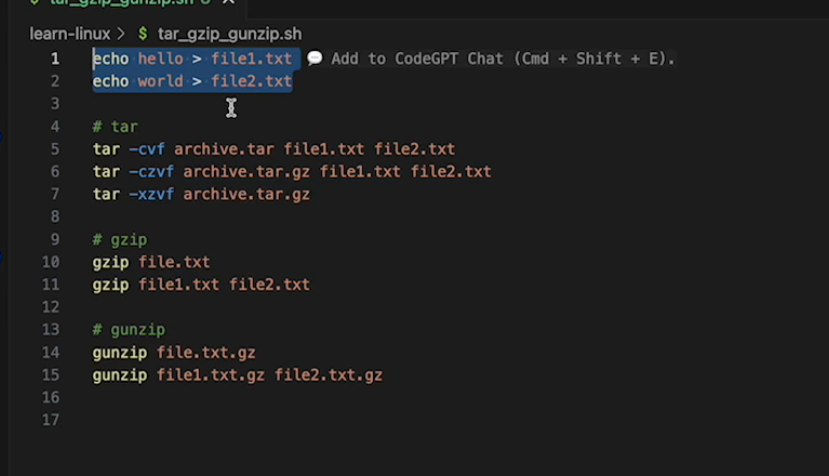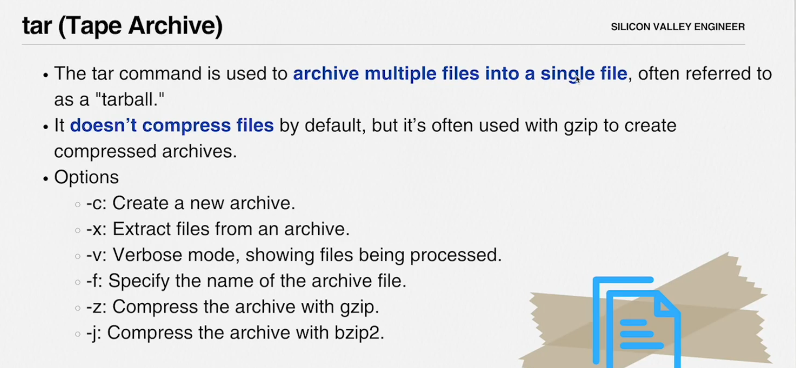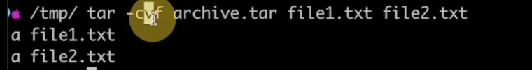 tar -cvf (creation, verbose{log}, f {file name}) archive.tar file1.txt file2.txt